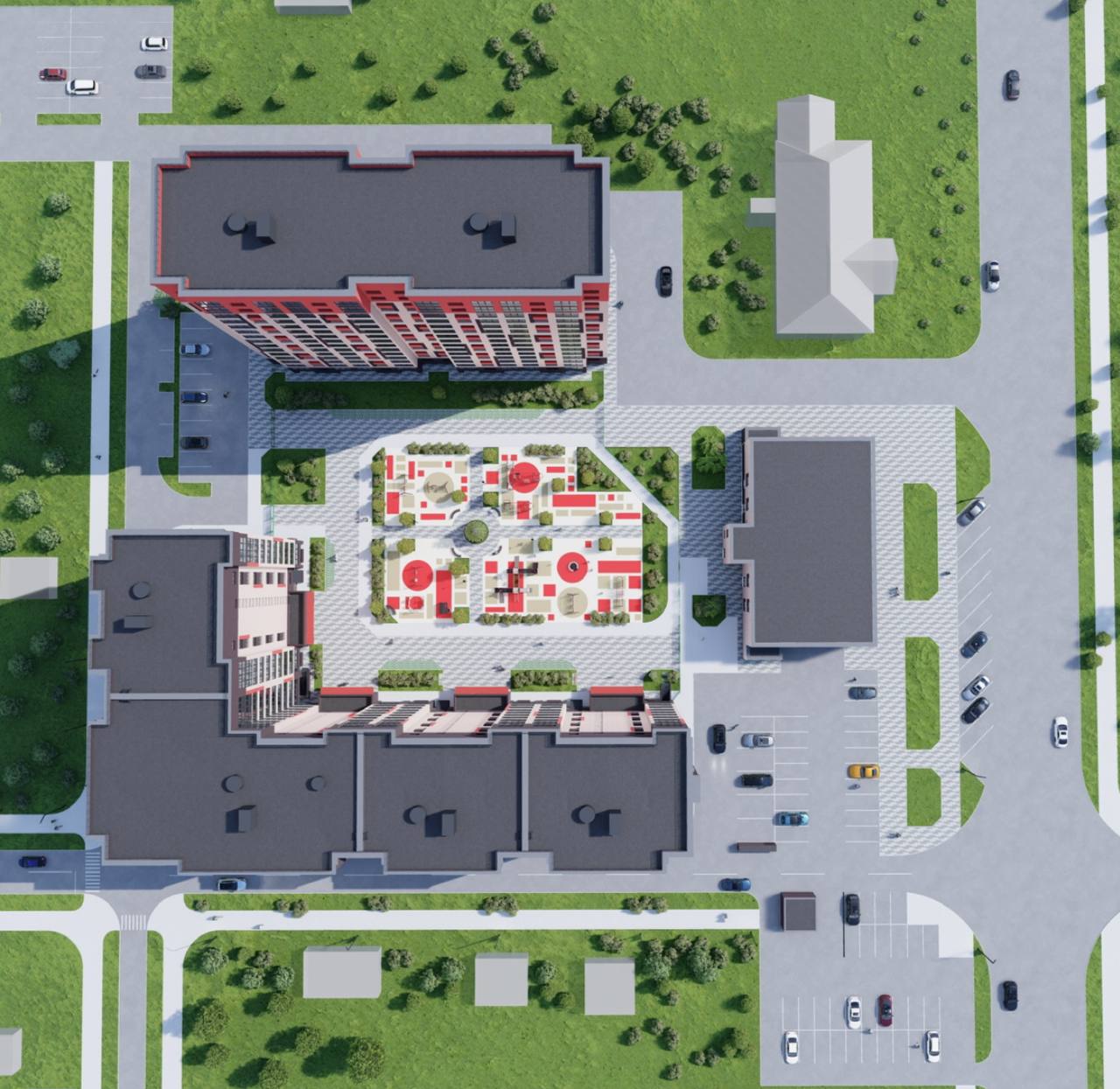 В комплексе двор запроектирован в концепции: закрытый безбарьерный двор без машин. Все парковки вынесены за периметр двора и автомобили не будут мешать выходящим из подъездов людям попадать во двор. Безопасность усиливается наличием ограждения общего двора квартала.